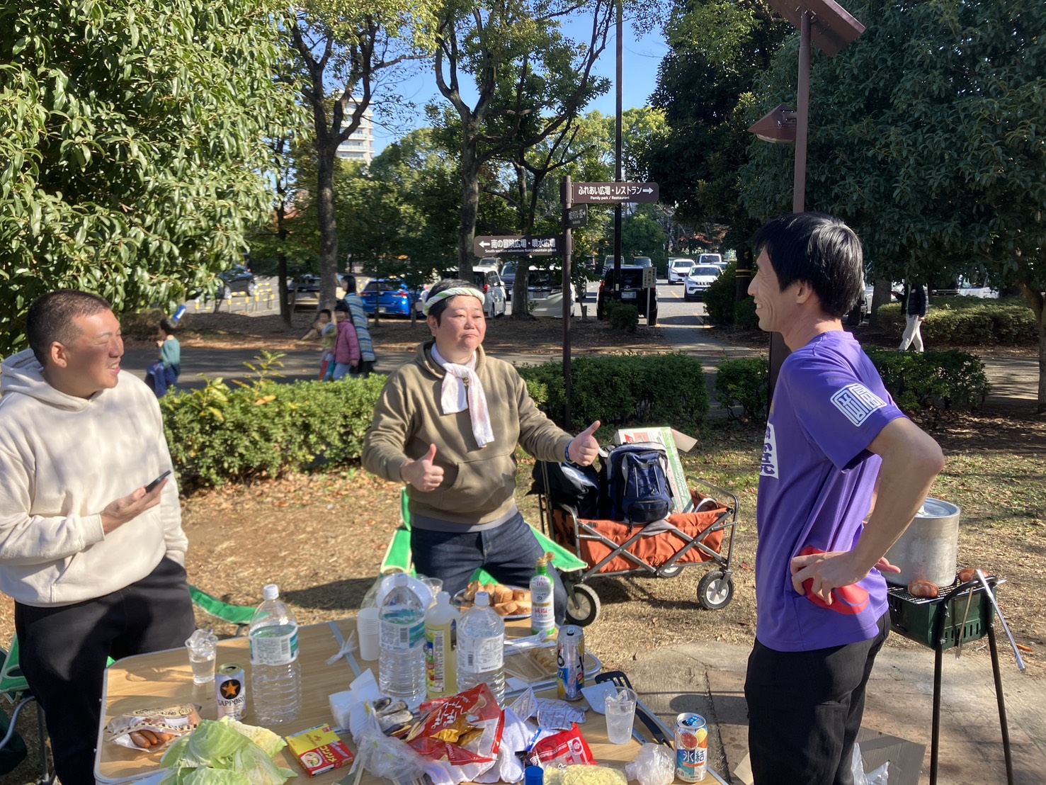 昼間は木場公園で「焚火会」。BBQコンロで“焼きそば”や“ポトフ”を作りました。